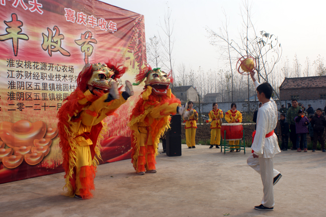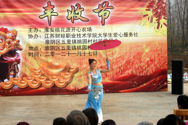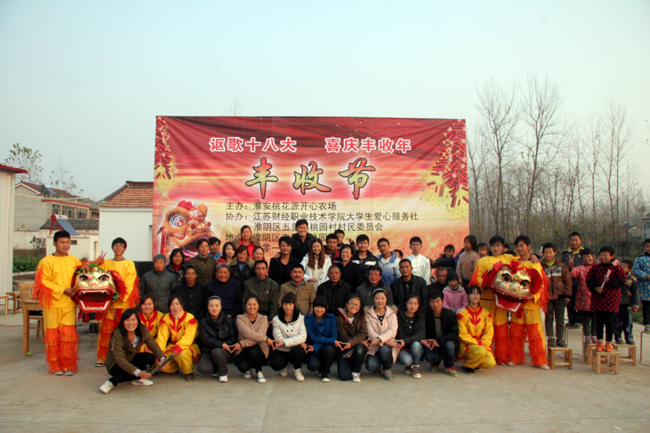 “好收成,好收成,好收成是小伙子秋后的新洞房;好收成,好收成,好收成是娃娃们过年的鞭炮声。好收成是咱老百姓的好日子,伴着金风落在农家小院中……”在党的十八大圆满落幕之际,淮安市淮阴区五里镇桃园村“桃花源开心农场”也迎来了一个黄金丰收年,11月17日,学院师生走进 “桃花源开心农场” 和村民一起载歌载舞喜迎丰收年。
