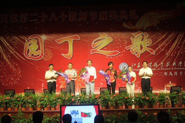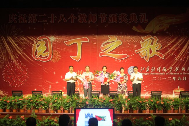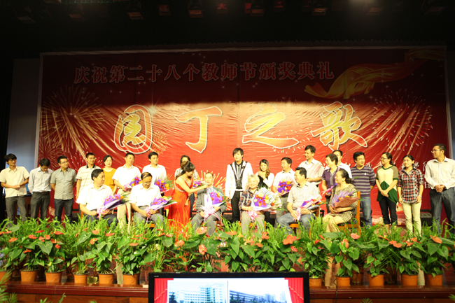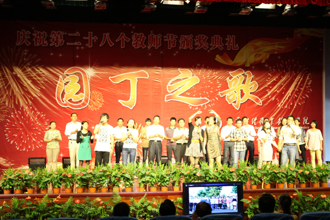 伴随着屏幕上不断滚动展示的优秀教师照片,何秀贤被表彰为“师德模范”,陆霞被表彰为“教学名师”,邹�u被表彰为“教学标兵”, 刘亚等等46名专(兼)职教师被表彰为“优秀教师”, 吴媛媛等15名教师被表彰为“优秀班主任”, 丁胜利等4名教师被表彰为“优秀辅导员”, 黄昆等3名教师被表彰为“优秀教务员”, 郁士宽等17名教师被表彰为“优秀教育工作者”,学院领导向获奖者颁奖并合影留念。