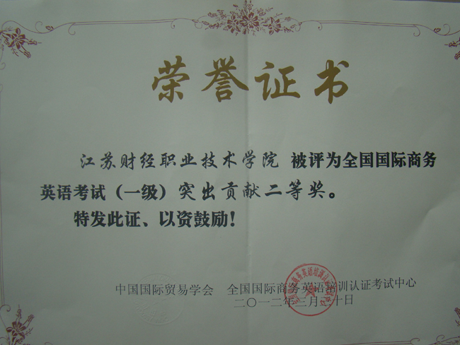 近日,从全国国际商务英语考试暨全国职场英语考试2012年度工作会议上传来喜讯,我院全国国际商务英语考试考点被中国国际贸易学会及全国国际商务英语考试中心评为突出贡献二等奖。据悉,本次会议共评出突出贡献一等奖3个、二等奖5个、三等奖12个,其中获奖的江苏考点仅有3个。