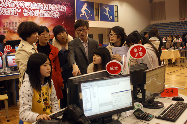 “请老师们注意:我们为大家发放的资料袋中包含了这次大赛的赛项指南,请大家严格遵守日程安排。”为确保大赛的顺利进行,4月19日下午5点30分, “2013年江苏省高等职业院校‘用友新道杯’会计技能大赛”的47支队伍参加赛前指导会议,各代表队依次抽签,进行模拟训练。