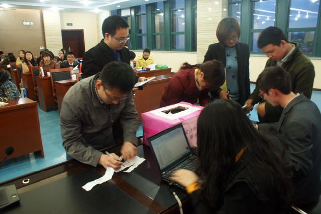 指导会上,讲解老师不断提醒各队老师注意相关细节,并依次讲解了大赛的流程,应注意的事项。随后,指导老师们走上抽签台分别进行会计信息化比赛和手工比赛项目的抽签、登记,根据抽签规则,按照本次大赛报名顺序来抽签决定参赛选手的比赛位置,“老师,怎么样啊?”会议室外,学生们紧张的等候着抽签结果。