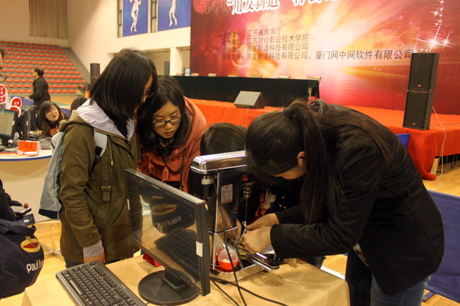 抽签仪结束后,参赛队伍转战赛场,进行模拟操作,熟悉赛事环境。“老师,我的系统怎么会进不去啊?”现场蓝色“咨询”牌“层层叠起”,大赛技术人员耐心的为选手们解决各种疑惑,确保每个参赛队都能及时准确地了解比赛规则与细节。“请同学们注意一下,我们现在是模拟登陆与赛事无关,只是让大家熟悉一下比赛流程,请大家在15分钟之内点击交卷退出系统。退出系统后,请大家统一到学院餐厅就餐。”技术人员一遍又一遍的提醒选手。