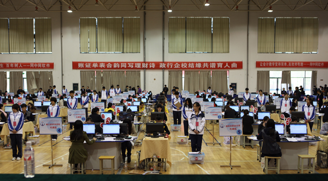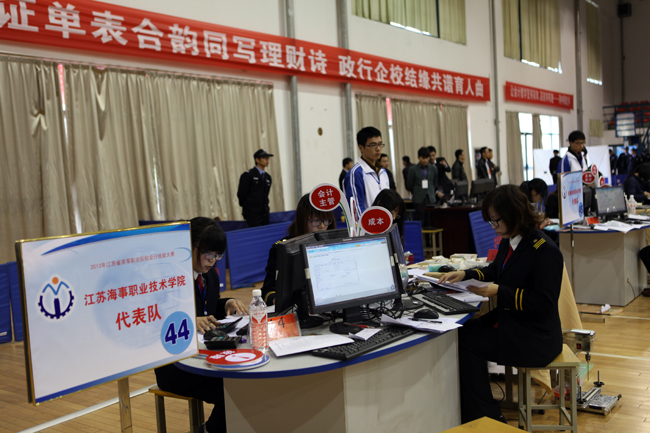 “赛场上的一个参赛队就如同一个财务科,会计技能竞赛就是由系统软件虚拟同一家公司,给出同样的会计任务,如:记账凭证、现金日记账、银行存款、编制会计报表……然后根据各个参赛队的速度与准确度,来给出具体的分数。选手们四人组成一个团队,分别扮演出纳、成本会计、总账会计、会计主管四个角色,大家各司其职,协调配合。”我院会计系主任张卫平讲解到。