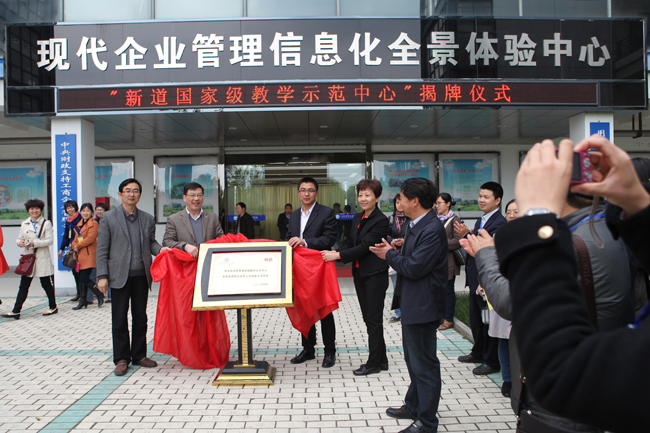 4月20日下午,学院院长陈光曙与北京用友新道科技有限公司总经理范光辉在现代企业信息化管理体验中心门前为“新道国家级教学示范中心”揭牌。铜牌上闪烁着“用友新道国家级实践教学示范中心·用友新道校企合作人才培养示范院校”。