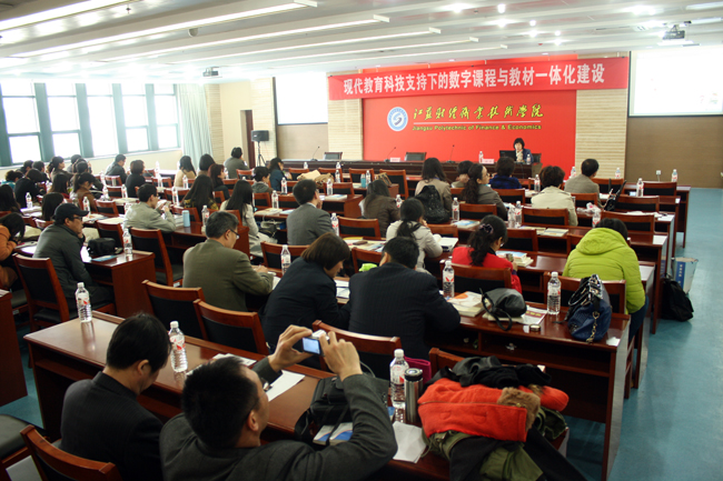 讲座中,赵社长回顾并分析了国家精品开放课程的情况、对课程变化的认识、精品资源共享课内涵、国家专业教学资源库建设项目以及对教材建设的思考,指出纸质课程存在的问题,说明数字化精品课程在教育领域的重要作用。就教学方式方法,赵社长提出“四点变化”:一是由学科性到能力本位的转变;二是教师与学生转变角色,从以教为主转变为以学为主,充分调动学生自觉学习的积极性;三是教学统一转变为灵活多样,强调以能力作为教学的基础;四是由注重教学结果转变为注重教学过程,要根据能力标准以过程考核代替传统的一次性考核。随后,赵社长又从国家精品课程的分布、专业分布、区域分布、院校分布、课程类型分布、时间分布等六个方面分析了国家精品课程的总体情况。赵社长指出,国家精品战略教材应同时具备四大点,即:有模型、有案例、有分析、有应用。