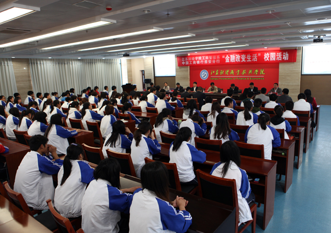 工商银行淮安分行纪委副书记陈越峰介绍了工商银行淮安分行的发展、规模和企业文化。工商银行江苏省分行电子银行部专家吕允利为同学们作了产品介绍与演示,其中手机银行的功能和优势的介绍引起了在场师生的强烈兴趣。活动现场,还设置了抽奖环节与互动答疑,兼具知识性与趣味性,现场气氛十分活跃。