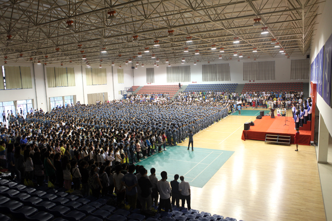 整齐的海蓝色队伍伴随着柔和的音乐,学生们有序的进入训练馆。学院领导也“隐匿”其中,列队跟新生和教师们站在一起。当副院长蒋超五介绍到场的领导时,学生们张望着惊讶地在人群的前方看到了挥手致意的院领导。
