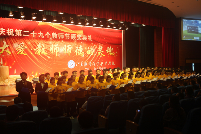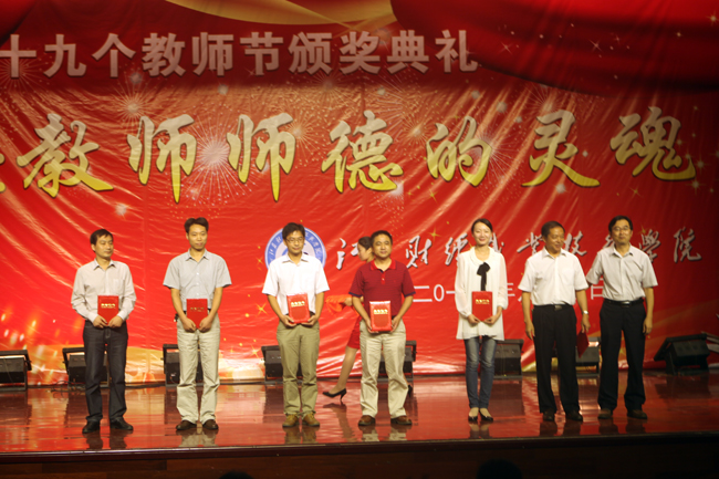 典礼上,学院党委书记吴兆方向朱莉云、施宣、刘必立、祁麟、戴光顺等5名30年教龄的教职工颁发荣誉证书。学院副院长蒋超五在典礼上宣读表彰决定,36名专任教师、9名兼课教师、2名兼职教师、19名教育工作者、5名辅导员、3名教务员以及19名优秀教育工作者受到学院表彰。