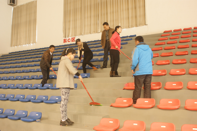 为了给每位运动员更为舒适的训练环境,也为了给明天的观众们一个清爽的观看环境。我院学生党支部全体党员老师们自发到训练馆做起清洁保障工作,每个党员各司其职,纷纷拿起打扫工具,对整个球场的地板,观众席座位以及扶手等进行了清扫擦拭。老师们个个干的热火朝天,把整个球场擦拭的焕然一新,此举赢得了在场的高校师生们的一致赞誉。