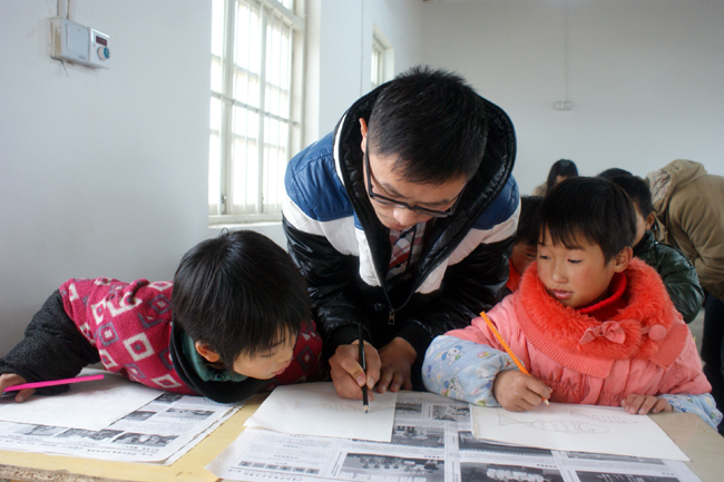 “小朋友们,过年的时候想让爸爸妈妈送给你们什么礼物啊?现在咱们一起画出来好不好?”画超人,画汽车,画玩偶,还是在原来的暑期辅导教室里,“老师们”又给村子里的留守儿童上了课,“哥哥,你看,我画的是一架小飞机,一年级的小朋友王晨宇歪着脑袋,举着 “作品”给“老师”看”。“过年我什么礼物都不想要,我只想要我爸爸妈妈回来陪我过年。”二年级的小朋友潘美娟在“下课”的时候偷偷地告诉“草帽哥哥”。“小强哥哥,我的数学作业不会,你教我好不好。”四年级小姑娘周瞳很不好意思的请“数学老师周强”为自己“开小灶”。