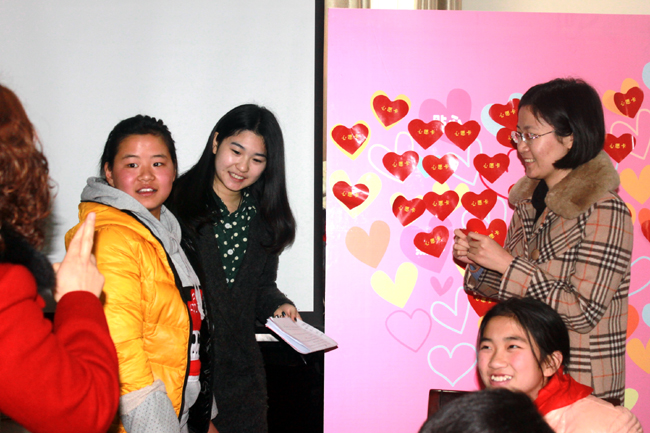 志愿者还为每位同学精心制作了一枚心愿卡,每位同学可以把自己的心愿写在卡上,然后依次粘在心愿墙上,参加活动的领导将和志愿者一起帮他们实现自己的心愿。张玉静同学的心愿是:“想要一本《百科全书》”,团市委沈晓红书记当场承诺一定帮她实现心愿;陈洁同学的心愿是:“我喜欢跳舞,希望能有一位老师教我”, 团市委李义翠书记则表示将联系团市委的淮安市青少年宫,为她请一位最好的舞蹈老师……