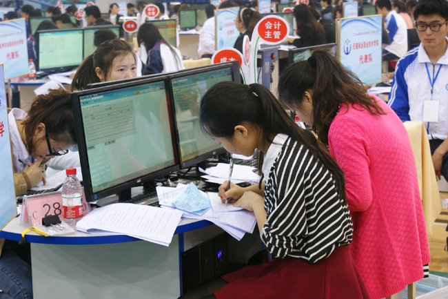 “2014年江苏省高等职业院校‘用友新道杯’会计技能大赛,正式开赛!”4月25日,裁判一声令下,赛事拉开帷幕,51支来自全省各地的选手迅速投入高度紧张的状态,开始了会计技能的角逐。点钞、报表、汇总……分工明确,配合默契,那充满节奏的‘工作’身影,俨然构成一曲跌宕起伏的交响乐。