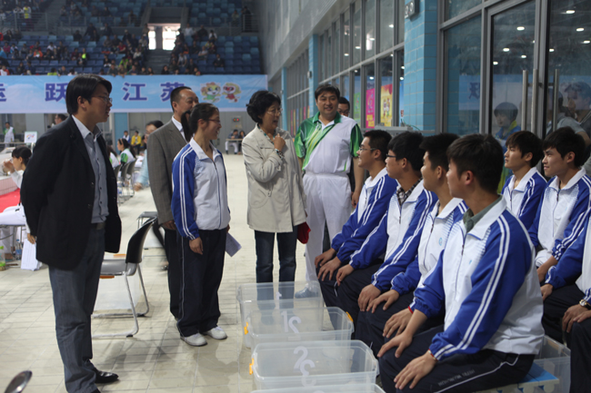 刘书记首先与淮安市体育中心吴鹤飞书记进行了深入交谈,深入了解我院志愿者的工作情况。吴鹤飞书记对我院志愿者数日来的辛勤工作表示感谢,并充分肯定了我院志愿者的务实、敬业、奉献的工作作风。