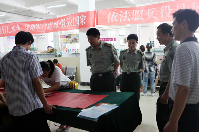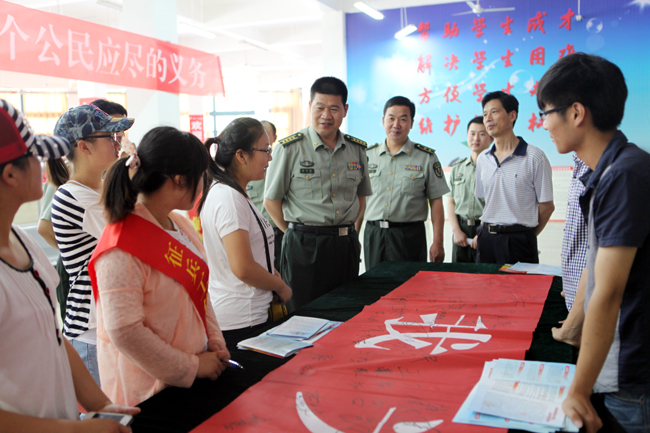 6月12日上午,在军分区统一部署下,我院在大学生事务中心开展了“征兵宣传校园行”活动,我院学生积极到现在咨询报名,并在“我为国防添风采”的横幅上签名,响应祖国号召,积极报名应征,部分同学还现场利用现场电脑进行网上报名。