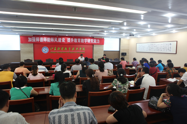 此次讲座是学院师德师能师风建设系列活动之一,讲座旨在开阔广大教师的理论视野,更新职业教育理念,提升教育教学研究能力。新一届院领导十分重视此次讲座活动,学院党委书记韩香云、院长程淮中、副院长杜萍均出席了活动。杜院长要求全院教师努力学习,潜心专研,努力让学习和研究成为习惯,不断提升自己的教育教学能力及研究能力。