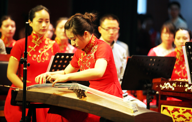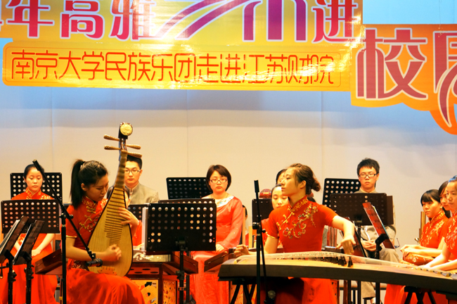 古典、雅致的演出服,精致、温婉的妆容,精彩、投入的表演,6月15日下午,南京大学民族乐团应邀走进我院,为师生献上一场高雅的艺术盛宴。南京大学团委副书记李浩,教育厅项目督察员丁小兵,学院党委委员、副院长张春,共青团淮安市委副书记李义翠,学校部部长王乐华;学院团委书记、组织部副部长朱绍勇以及淮安市清河、清浦、淮阴、淮安团区委负责人、驻淮兄弟院校团委书记与近700名师生一起欣赏了音乐会。