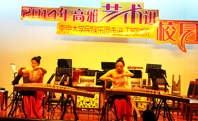 音乐会上,我院团委组宣部长、艺术指导教师刘海沁带领我院同学与南京大学民乐团同台献艺,展示了在江苏省大学生艺术展演中荣获器乐项目二等奖的古筝四重奏《渔舟唱晚》,技巧娴熟、配合默契,博得了全场热烈的掌声,同时得到张教授的高度评价。
