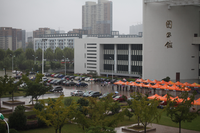 “今年的迎新现场像是人才招聘市场,人头攒动、摩肩接踵,还从没见过图书馆的停车场这么热闹。” 这是一次特殊的迎新,原本一切就续的图书馆前,早早布置好的明亮通透的迎新现场,因为淅淅沥沥的雨水,不得不转移到图书馆的地下车库。热闹的场面让今年的新生报到别有一番味道。