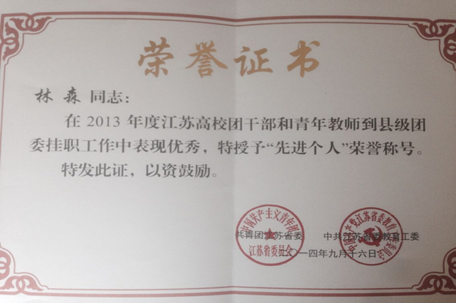 我校经济贸易学院团总支书记林森荣获江苏省教育工委、共青团省委授予的“挂职工作先进个人”称号。2013年10月,经济贸易学院团总支书记林森被选派到淮安区团委挂职团区委副书记一职。挂职以来,林森同志服从当地政府和组织的安排,深入基层,考察民情,走近群众,服务青年,扎实工作,锐意进取,为淮安区团的工作和服务地方经济社会发展做出了积极贡献,得到了当地政府领导、同事和青年群众的一致好评,也得到了上级团组织的充分肯定,展现了我院团干部良好的社会形象。
