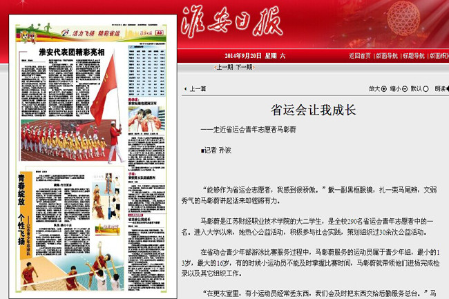 志愿者们光荣完成使命回校后,和同学们在一起分享着赛场服务中的点滴,相互交流心得体会,刘娇娇、李程青、赵雨婷、邵波等4位同学的心得体会相继被淮安团市委网站刊载。马彰蔚同学的事迹被《淮安日报》刊载。省十八运已经挥手告别,志愿者的经历让每个同学成长,在人生旅途中将留下难以忘怀的篇章。(工管学院供稿)