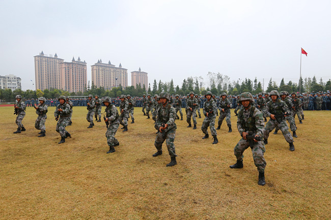 大会在隆重而热烈的气氛中拉开帷幕,在庄严的升国旗仪式后, 6个院系军训班级的分列式表演以其铿锵有力的步伐、整齐规范的动作、喊声震天的口号声赢得了场上阵阵掌声。随后,新生学员方阵为大家带来了精彩的军体拳表演,教官则表演了精彩的刺杀操,充分展示了学生和教官高昂的斗志和严明的军纪。