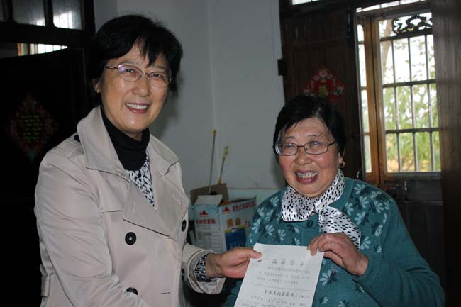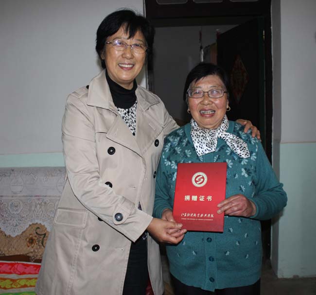 接过这珍贵的记忆和情感,刘书记再一次和徐大云校友深深地拥抱,并为徐大云校友颁发了捐赠证书。刘书记对徐大云校友说:感谢你为学校50年校庆献出珍贵的史料,我们将把它存入校史馆,让全体师生跟你一起珍藏!刘书记邀请徐大云校友能够回校参加50周年校庆,欢迎她继续关注母校,有空常回学校看看,并祝她身体健康,晚年幸福。