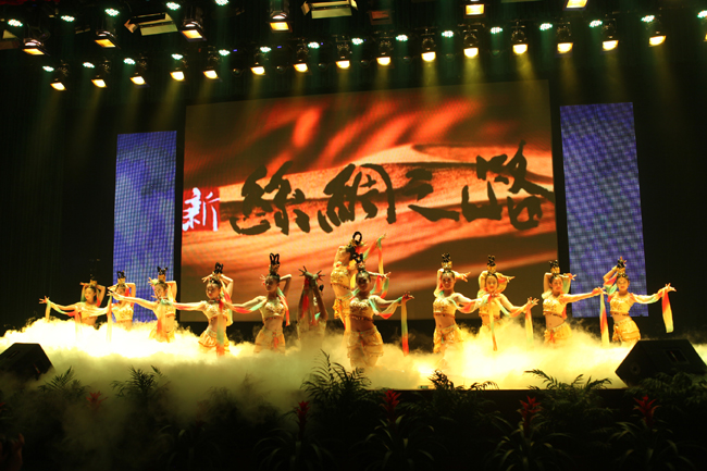 雾气弥漫,舞台上歌舞表演《新丝绸之路》里,一群衣袂飘飘的女子,轻柔地和着古典的旋律翩翩起舞,缎带纷飞中,似梦迷离,犹如降临人间的仙子,举手投足、一娉一笑,以一种恰到好处的“穿越”,将现场观众带进了奇妙与梦幻的“丝绸之旅”。随后上演的《茶马古道》则瞬间将丝绸之路的宁静与柔美,转换为深情高亢的刚毅与豪放,展现了改革时代的万马奔腾、百舸争流,一如拼搏向前的江苏财院展示着自己的独特的风采。
