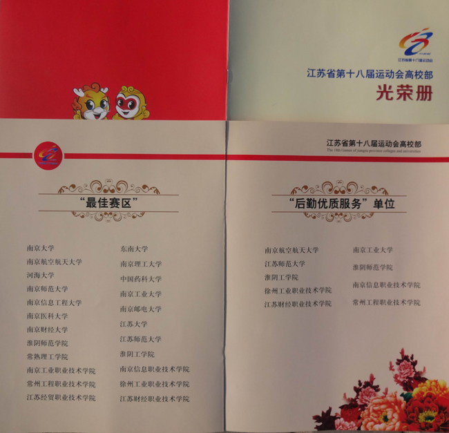 由于承办工作精心组织,服务周到,受到组委会、教育厅、大体协及社会各界的一致好评,我校被江苏省教育厅、体育局评为省十八届运动会高校部比赛“最佳赛区”并被授予“最佳后勤服务单位”荣誉称号。(侍勇)