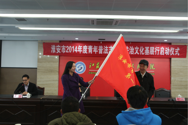 启动仪式上原淮安市人大常委会副主任、市关工委副主任刘群为我院普法志愿者分队授旗: