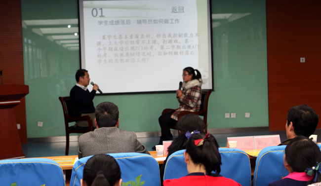 从考察辅导员应变能力环节到考验辅导员们文字功底的微博写作环节,退学倾向、忧郁倾向、家庭困难……在谈心谈话环节,学生演员通过模拟大学生生活中遇到的问题,与辅导员现场沟通,现场解决,学生演员的积极配合拉进了辅导员与学生的距离。在第四会议室内,辅导员们都打开了自己的手机,编写微博。
