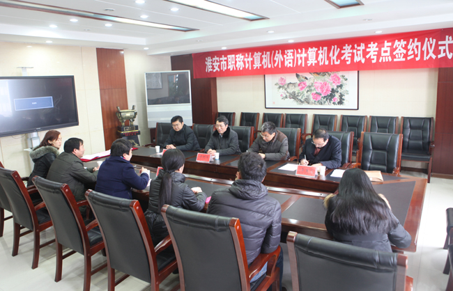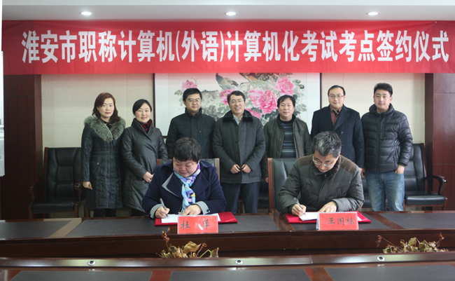 3月4日上午,淮安市职称计算机(外语)计算机化考试江苏财经职业技术学院考点签约仪式在学校行政楼318举行。市人社局党委委员、医保中心主任陈树国,市人事考试中心主任(书记)王国栋一行4人出席签约仪式。副校长杜萍,教务处副处长王丹,教务处副处长陈振东,教务处教务科科长徐白梅,教务处实践科科长朱军参加签约仪式。