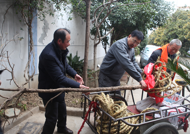 “这棵丁香开的是紫色花,所以也叫紫丁香,现在开始发芽了,正是移栽种植的好时候。”5日上午,学校后勤管理处处长梁丛平、副处长朱文军等应邀来到老书记家里移植丁香树,说起这棵丁香树,朱书记介绍了树的“独特”来历,“2005年学校升格之初,从五台山移居淮安,当时还是棵只能种在花盆里的幼苗,于是借种在我家院子里,如今已经成树了。”朱书记边说边同大家一起把这课栽培了十年的丁香树往车上搬。