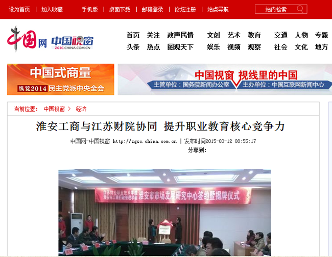 中国网中国讯 为促进江苏淮安经济社会稳步发展,工商部门充分发挥职能作用,实现全民创业、淮商崛起,做出应有贡献的新要求,进一步推动校企深度合作,积极探索政行校企四方联动发展新机制,促进省级示范性院校建设,3月11日下午,淮安工商局与江苏财经学院举行战略合作签约揭牌仪式。淮安市工商行政管理局党委书记、局长蔡莉、副局长陆卫东等领导,与江苏财院校长程淮中、党委副书记刘芳等学院领导、各相关职能部门、系(院)负责人、已及中国网、新华日报、现代快报、江苏经济报、淮安电视台等媒体记者出席了本次战略合作签约揭牌仪式。