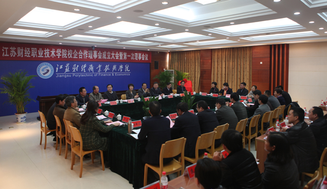 理事会首批会员共邀请40余家企业加入,学校目前已在江苏今世缘酒业股份有限公司等合作企业建设了17个驻企工作站。会上通过了《江苏财经职业技术学院校企合作理事会章程草案》。自2014年我校牵头组建了“江苏财经职业教育集团”,联合省内102家政府、行(企)业、院校实现政行企校优势互补、资源共享。学校与国内知名企业建立了“今世缘营销学院”、“紫金保险学院”、“中央新亚管理学院”、“京东电商学院”等多个校企合作二级学院以及用友会计人才培养基地、中锐汽车商务基地等多个校企合作发展基地,与江苏银行、淮钢集团、海尔集团等676家单位签订合作协议,与京东商城、苏宁电器等20多家企业合作开展订单培养。