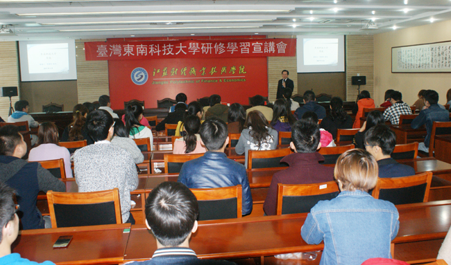 在会议室,两位校长与来宾一行开展了围绕两校师生交流主题的座谈会,教务处、学生处、港澳台办主要负责人参加座谈。程校长向来宾介绍了我校的教育教学情况和校际合作交流成果,东南科技大学李清吟校长则详细介绍了东南的发展历史、教育概况和办学绩效,并谈到对苏北地区的合作渊源与淮安情结。为加深我校学生对东南科大的了解,促进学生交流,在随后举办的赴台研修宣讲会上,李校长图文并茂地向我校各院系学生代表介绍了台湾风土人情、当地职教特色以及东南发展历史,为同学们开启了一段别开生面的台湾学习视觉之旅,不少与会学生当场表示愿意参加赴台研修,去体验宝岛台湾的学习,感受海峡对岸的生活。(港澳台办供稿)
