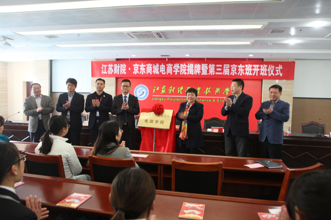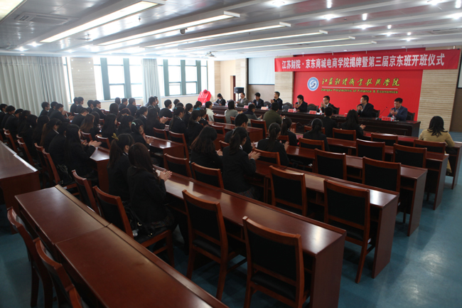 4月21日上午,暖风和煦,春意盎然。“江苏财经·京东商城电商学院”揭牌暨第三届“京东班”开班仪式在学院图书馆第一会议室隆重举行。京东商城全国客服中心副总经理牛刚、党委书记兼人力资源部总监汪世龙、人力资源部高级经理蔡旭、学校副校长杜萍、校企合作办公室副主任(主持)王立强、经济贸易学院全体党政领导班子、教师代表、“京东班”优秀学生代表参加仪式。