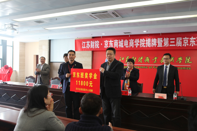 随后,京东全国客服中心人力资源部总监汪世龙先生、江苏财经职业技术学院经贸学院院长笪建军先生分别代表校企合作双方举行奖学金和奖教基金捐受仪式。