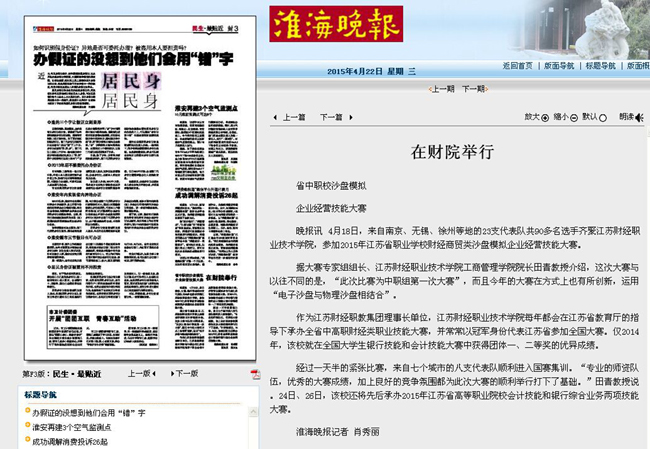 晚报讯 4月18日,来自南京、无锡、徐州等地的23支代表队共90多名选手齐聚江苏财经职业技术学院, 参加2015年江苏省职业学校财经商贸类沙盘模拟企业经营技能大赛。
