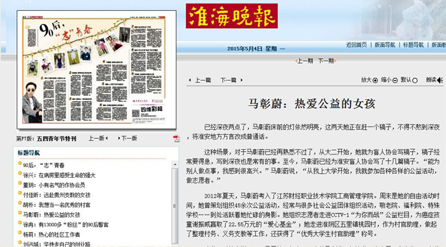 这种场景,对于马彰蔚已经再熟悉不过了,从大二开始,她就为盲人协会写稿子,稿子经常要得急,写到深夜也是常有的事。至今,马彰蔚已经为淮安盲人协会写了十几篇稿子。“能为别人做点事,我感到很高兴。”马彰蔚说,“从我上大学开始,我就参加各种各样的公益活动,做志愿者。”