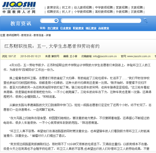 “环卫工人一直是受人尊敬的群体,他们起早贪黑地为我们城市的环境做出了很大的贡献。五一劳动节来临之际,我们组织了这次体验‘城市美容师’工作的活动,希望同学们能体会到环卫工人的不易,通过自身的行动影响更多身边的人保护我们的城市环境,也算是为淮安市‘四城同创’工作出一份力吧。”活动结束后,组织者江苏财经职业技术学院会计学院沈玲老师如是说。
