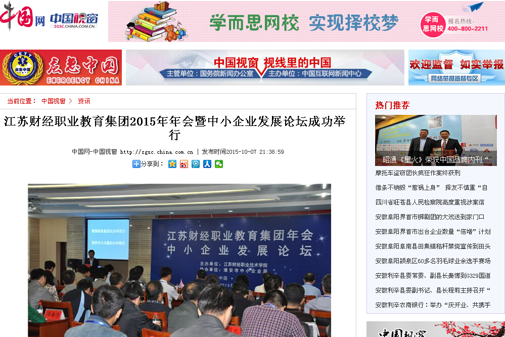 中国网中国视窗讯(华威 通讯员:孟文玉)10月7日,江苏财经职业教育集团2015年年会暨中小企业发展论坛在江苏财经职业技术学院成功举行。江苏财经职业教育集团自2014年3月组建以来,积极发挥“职业教育集团在促进教育链和产业链有机融合中的重要作用”,不断探索“合作办学、合作育人、合作就业、合作发展”的新路,在深化产教融合、校企合作方面做了大量工作,取得了比较好的成效,近年来,江苏财经职教集团规模不断壮大,影响越来越广。