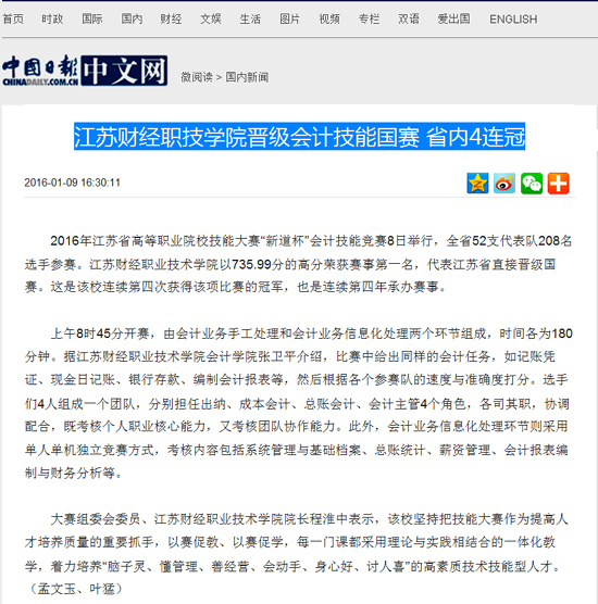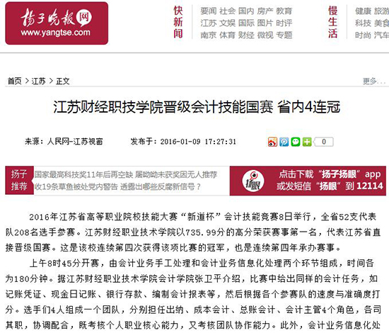 2016年江苏省高等职业院校技能大赛“新道杯”会计技能竞赛8日举行,全省52支代表队208名选手参赛。江苏财经职业技术学院以735.99分的高分荣获赛事第一名,代表江苏省直接晋级国赛。这是该校连续第四次获得该项比赛的冠军,也是连续第四年承办赛事。