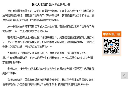 暑期以来,淮安共有8所高校约500多名大学生志愿者参与到“百千万”志愿服务关爱行动中。