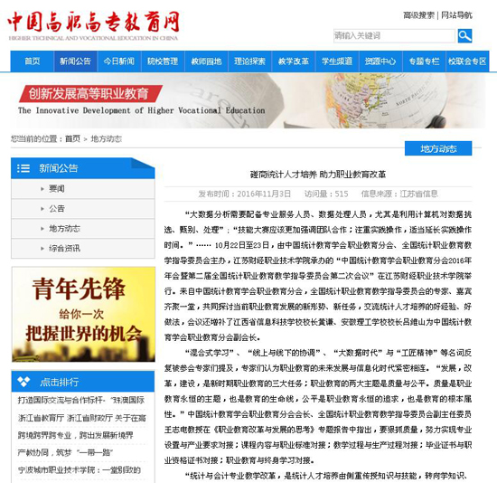 “大数据分析需要配备专业服务人员、数据处理人员,尤其是利用计算机对数据挑选、甄别、处理”;“技能大赛应该更加强调团队合作;注重实践操作,适当延长实践操作时间。”…… 10月22日至23日,由中国统计教育学会职业教育分会、全国统计职业教育教学指导委员会主办,江苏财经职业技术学院承办的“中国统计教育学会职业教育分会2016年年会暨第二届全国统计职业教育教学指导委员会第二次会议”在江苏财经职业技术学院举行。来自中国统计教育学会职业教育分会,全国统计职业教育教学指导委员会的专家、嘉宾齐聚一堂,共同探讨当前职业教育发展的新形势、新任务,交流统计人才培养的好经验、好做法,会议还增补了江西省信息科技学校校长黄谦、安徽理工学校校长吕维山为中国统计教育学会职业教育分会副会长。