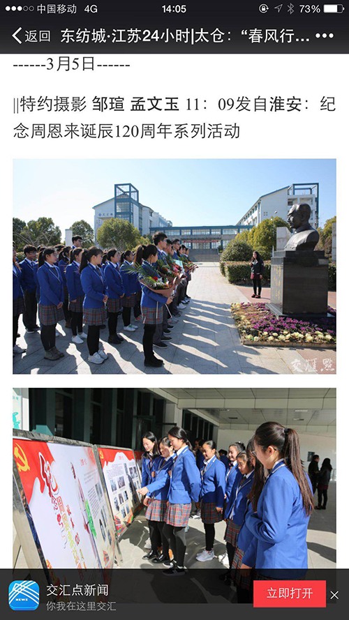 (邹瑄、孟文玉摄影报道)3月5日,淮安,江苏财经职业技术学院学生自发来到学校翔宇广场,向周恩来总理铜像献花。与此同时,该校还组织了以纪念周恩来诞辰120周年为主题的开学第一课、周恩来精神图片展等系列活动,编印了《周恩来精神研究在财院——论文集》和《翔宇文化润心田——实践集》。