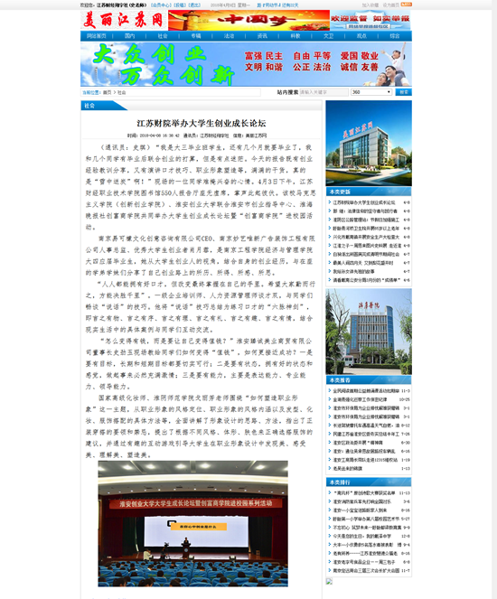 (通讯员:史琪)“我是大三毕业班学生,还有几个月就要毕业了,我和几个同学有毕业后联合创业的打算,但是有点迷茫。今天的报告既有创业经验教训分享,又有演讲口才技巧、职业形象塑造等,满满的干货,真的是“雪中送炭”啊!”现场的一位同学难掩兴奋的心情。4月3日下午,江苏财经职业技术学院图书馆550人报告厅座无虚席,掌声此起彼伏。该校马克思主义学院(创新创业学院)、淮安创业大学联合淮安市创业指导中心、淮海晚报社创富商学院共同举办大学生创业成长论坛暨“创富商学院”进校园活动。