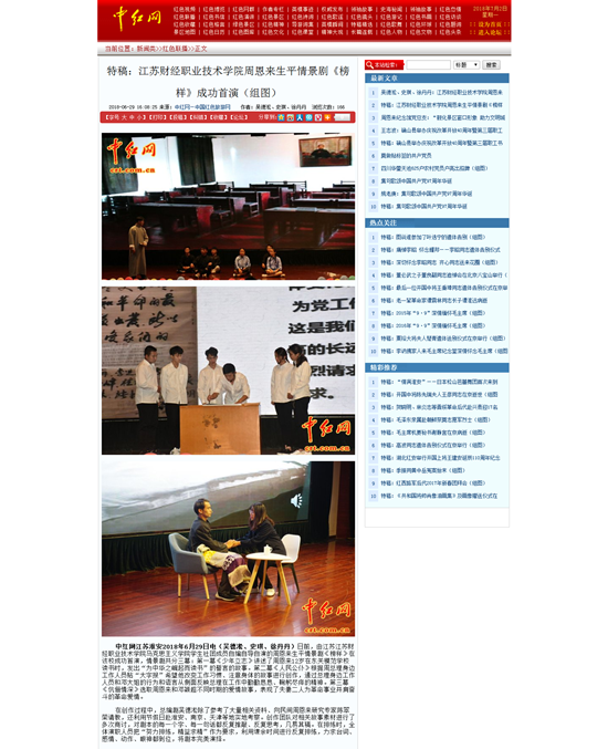 (马院供稿 通讯员:吴德淞 史琪 徐丹丹)日前,由江苏江苏财经职业技术学院马克思主义学院学生社团成员自编自导自演的周恩来生平情景剧《榜样》在该校成功首演,情景剧共分三幕:第一幕《少年立志》讲述了周恩来12岁在东关模范学校读书时,发出“为中华之崛起而读书”的誓言的故事。第二幕《人民公仆》根据周总理身边工作人员贴“大字报”希望他改变工作习惯、注意身体的故事进行创作,通过总理身边工作人员和邓大姐的行为和语言从侧面反映总理在工作中勤勤恳恳、鞠躬尽瘁的精神。第三幕《伉俪情深》选取周恩来和邓颖超不同时期的爱情故事,表现了夫妻二人为革命事业并肩奋斗的革命爱情。