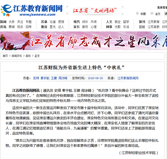 (通讯员:史琪 秦宇航 王娜 周冰峰)“吃月饼?看中秋晚会?这样过节的方式真的有点过时了。”在刚刚过去的中秋假期里,江苏财经职业技术学院的部分外省大一新生收到了该校马克思主义学院为他们定制的特色中秋礼物——地方特色文化之旅。
