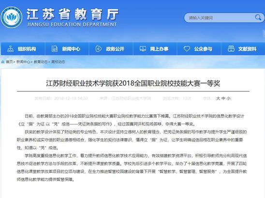 日前,由教育部主办的2018全国职业院校技能大赛职业院校教学能力比赛落下帷幕。江苏财经职业技术学院的信息化教学设计《立“据”为证 以“凭”成信——凭证类条据的写作》,经过国赛网评和现场答辩,夺得大赛一等奖。