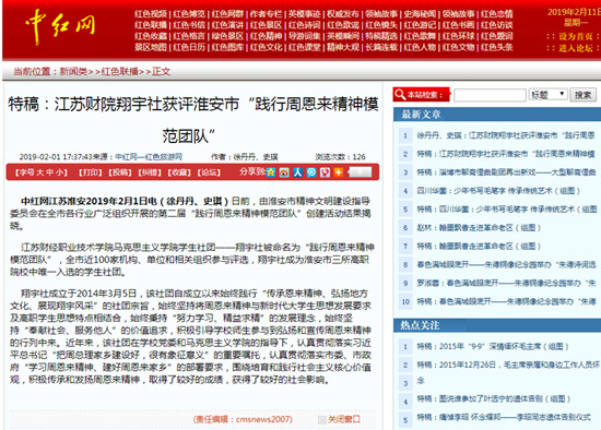 (通讯员:徐丹丹 史琪)日前,由淮安市精神文明建设指导委员会在全市各行业广泛组织开展的第二届“践行周恩来精神模范团队”创建活动结果揭晓。我校马克思主义学院学生社团——翔宇社被命名为“践行周恩来精神模范团队”,全市近100家机构、单位和相关组织参与评选,翔宇社成为淮安市高职院校中唯一入选的学生社团。